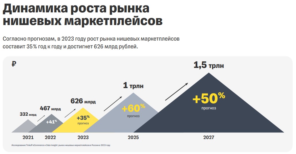 В 2023 году объем рынка отраслевых маркетплейсов вырос на треть и составил более 600 млрд рублей. По прогнозам Tinkoff eCommerce и Data Insight, при сохранении текущих темпов развития рынок может достичь 1,5 трлн рублей к 2027 году.